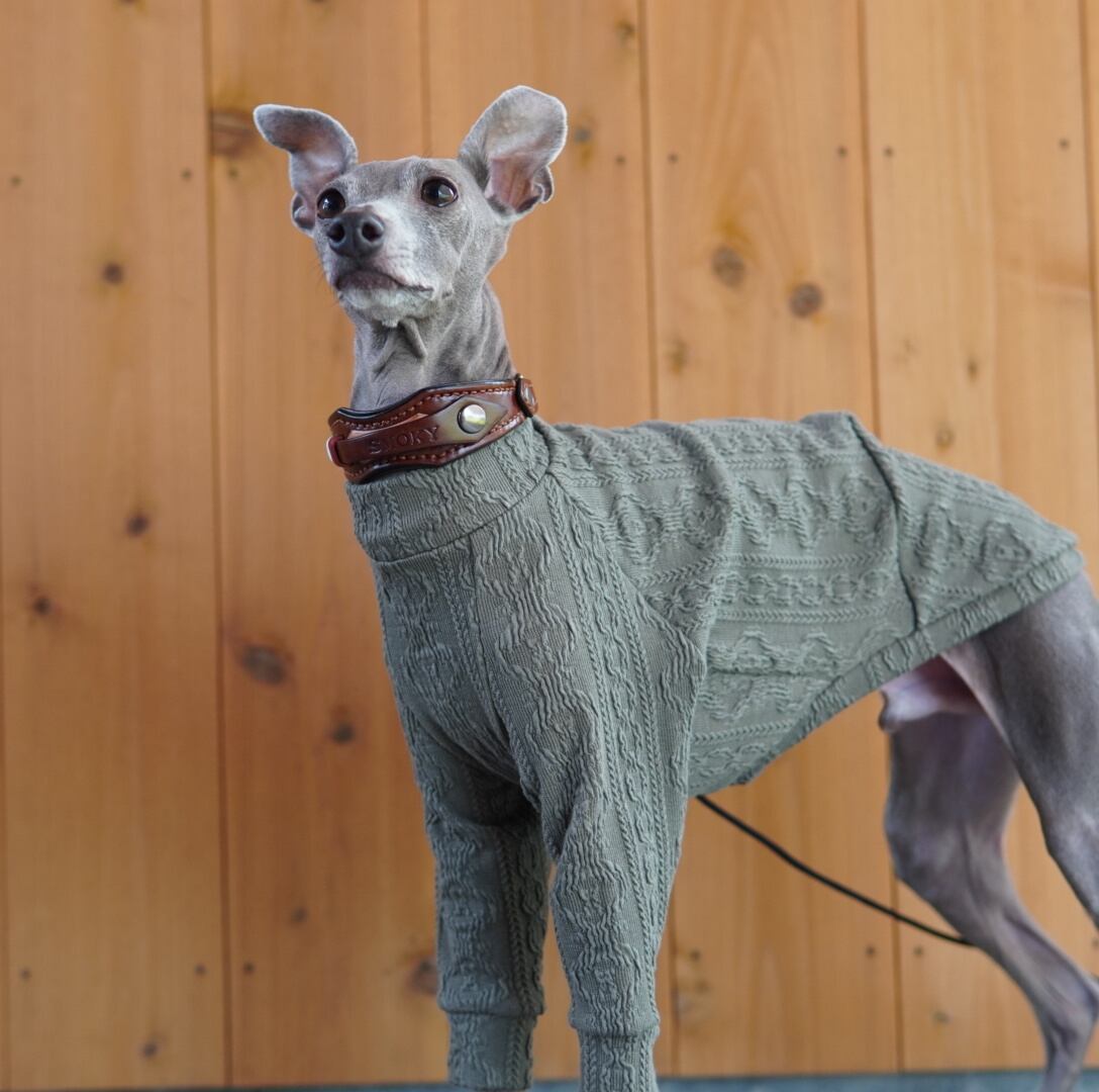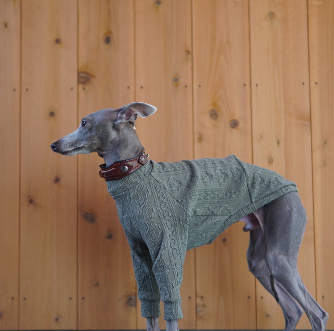 アラン風ニットです。 落ち着いた色合いのアースカラーカーキに編み模様がほっこりと 心温まるニット。生地は中肉くらいのほどよい厚みで横方向、縦方向にも良く 伸びます。