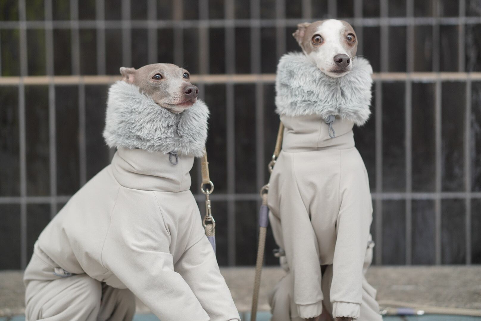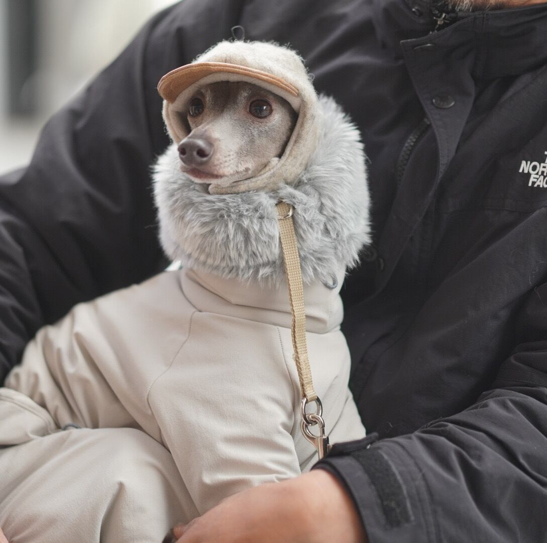 ボディはグレージュ、首元(ネック裏地)にはグレーのファーを合わせ、